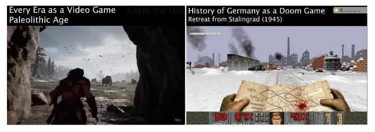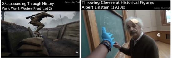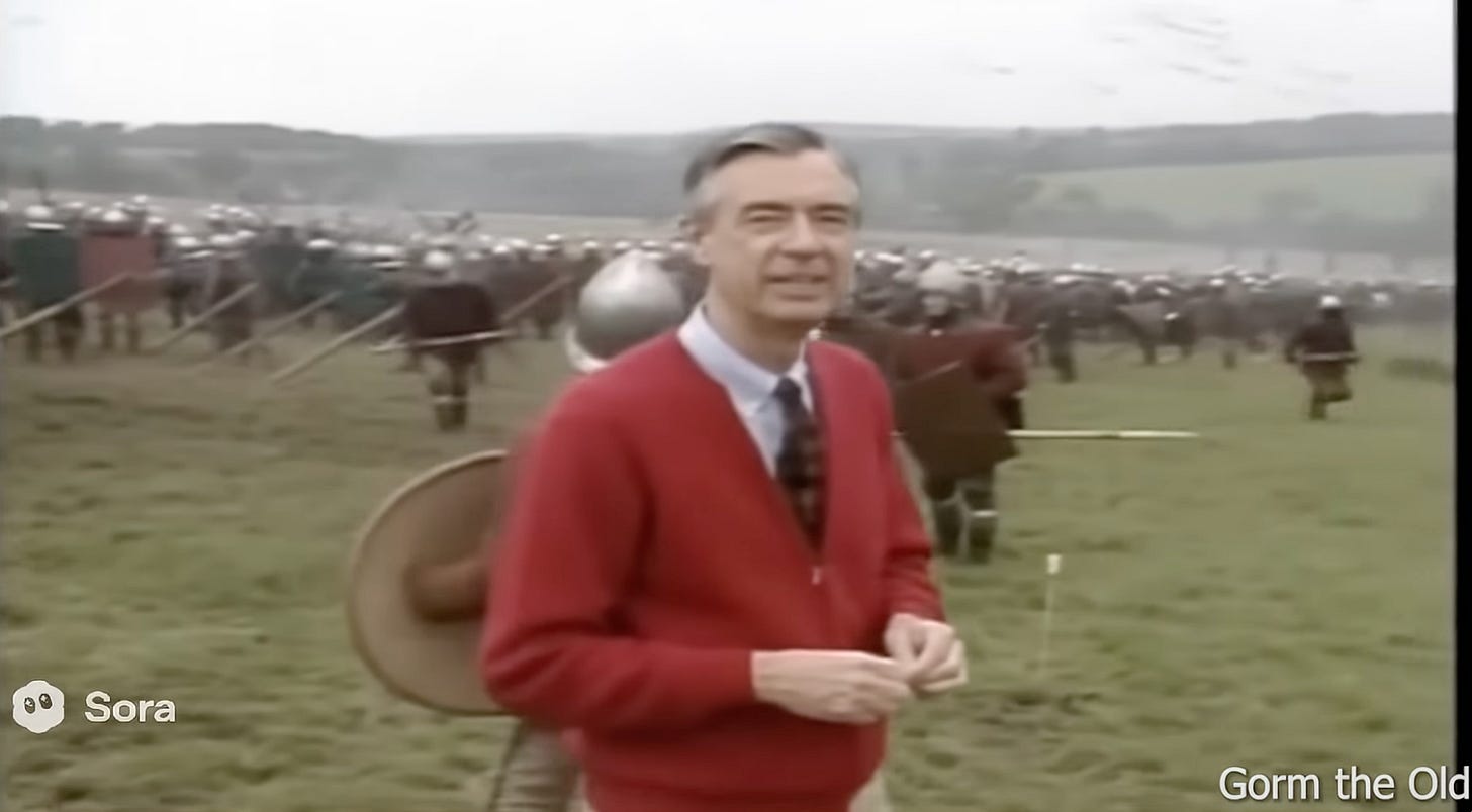 Which is to say not the dark-brooding founding Viking king of Denmark (circa 895-circa 960) but rather his impish latter-day doppelganger, the mysteriously pseudonymous keeper of the net-fief of that name, endlessly prolific generator (in his own characterization) of “The AI slop you just can’t help but love.” Such ridiculously inspired bêtises as “Every Era as a Video Game,” “The History of Germany as a Doom Game,” “Skateboarding Through History,” “Throwing Cheese at Historical Figures,” and, of course, “Mr. Rogers at the Battle of Agincourt”: