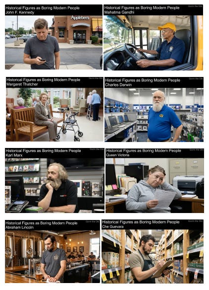 But lately, somehow, Mr. Old has been taking things to a whole new level, with frankly the most striking, disconcerting, and just plain dumbfounding deployment of AI tools that I myself have yet encountered. He has been calling the resultant four-part video series, “Historical Figures as Boring Modern People,”