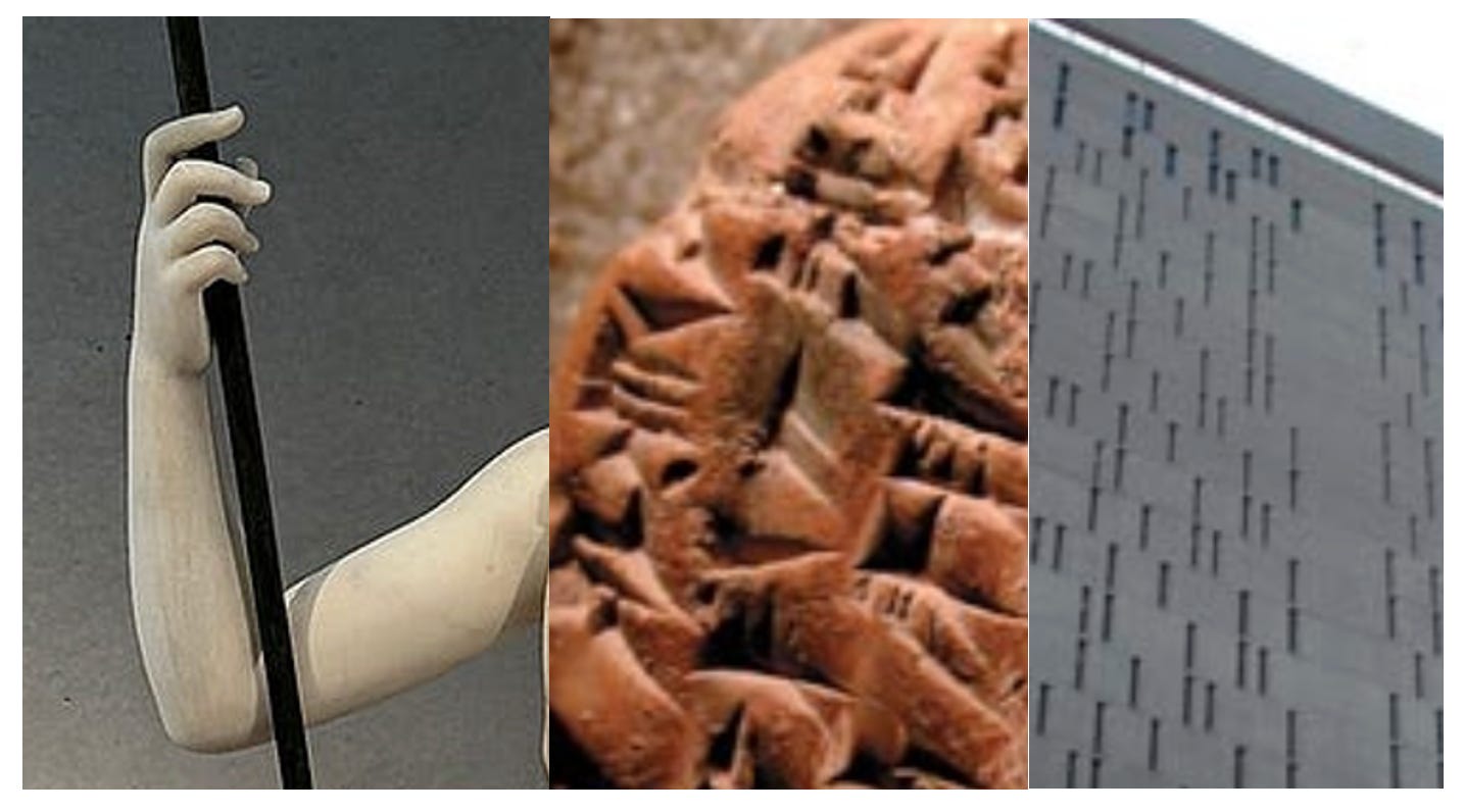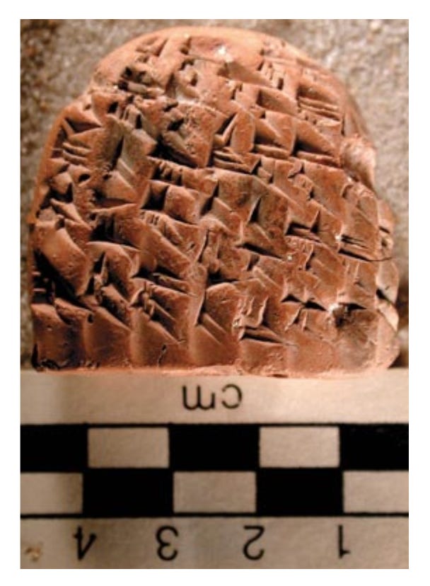 He picked one up at random: about the size of a dry cake of Shredded Wheat, and just about as legible, at least to my untrained eye. But Matt had no problem: “This one here, for example,” he said, palming the tablet and leaning it slightly so as to rake the light just so over its chicken-scratch jumble of markings, “it’s in a variant of the Elamite language, and it concerns, let’s see, ‘one thousand… eight hundred, thirty… eight… and-a-half units of barley’—a unit: that would be about ten quarts—let’s see: ‘received as rations for workers, for one month,’ various numbers of men and women, boys and girls—here’s the total: ‘702 workers.’ And then down here we have, hmmm, yes, ‘eleven units of wine’—again, about ten quarts each—‘for rations for women who have had babies, for one month,’ with the women who had boys getting twice as much as the women who had girls.”