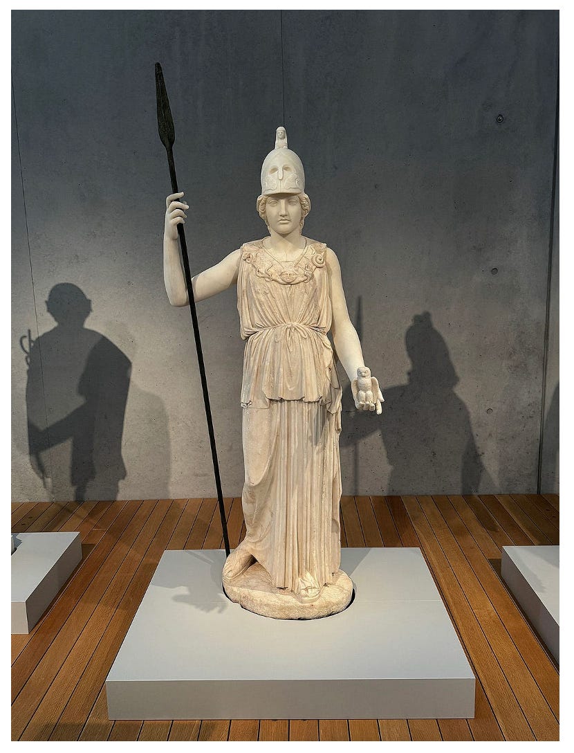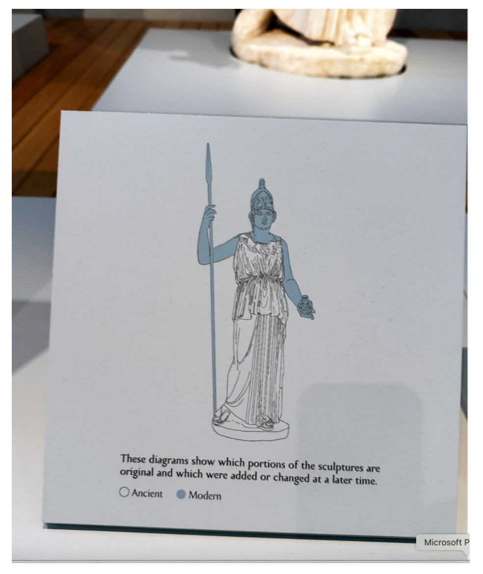 Because we know the statues were originally painted, we’ve all heard that. We know that the people who made these things had no interest in plain stone. But we still believe, reflexively, in the authenticity of the white marble. When we see the occasional digital re-creations showing the statues brightly painted—and there is a video at the Kimbell showing just that—they look garish, ridiculous.² These days, museums have whole conservation departments that specialize in cleaning paintings and restoring bronze patinas. But we never repaint the old marble statues. A replica maybe, like the giant Pallas Athena in the Nashville Parthenon. But never the original.